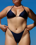 Le haut Layla est un classique. Il permet d'avoir un bronzage parfait! Délicat, confortable et léger, c'est un classique indémodable! Ce haut peut être porté de différentes façons, les cordes sont faites longues pour vous permettre de les placer comme vous le sentez. Les petits anneaux au devant sont de couleur or et les détails argentés à la fin des cordes sont amovibles. Ce bas de maillot bleu marine est un ajout essentiel à votre garde-robe.
